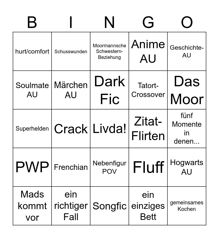 This bingo card has a free space and 24 words: Frenchian, ein richtiger Fall, Dark Fic, Mads kommt vor, Geschichte-AU, hurt/comfort, Soulmate AU, Schusswunden, Zitat-Flirten, Nebenfigur POV, Tatort-Crossover, Superhelden, Fluff, Hogwarts AU, Märchen AU, ein einziges Bett, fünf Momente in denen..., Moormannsche Schwestern-Beziehung, Das Moor, Crack, gemeinsames Kochen, PWP, Anime AU and Songfic.