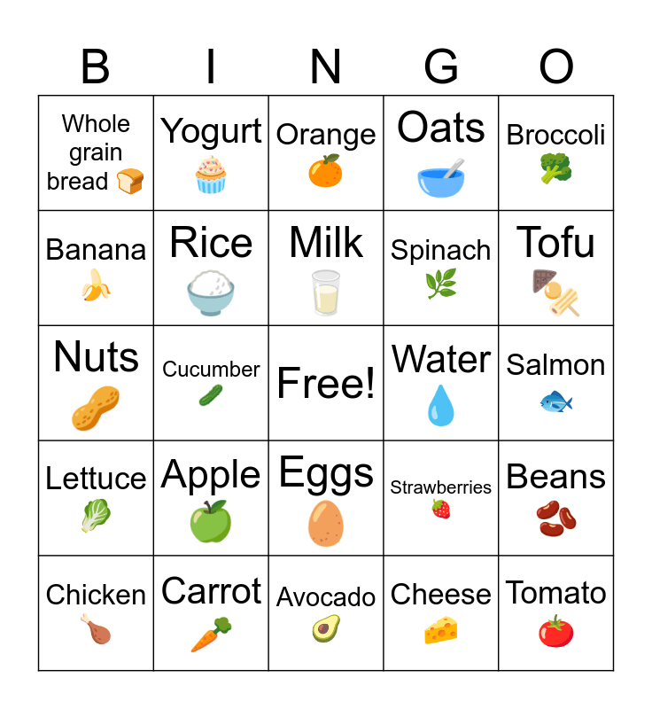 This bingo card has a free space and 24 words: Apple 🍏, Carrot 🥕, Milk 🥛, Chicken 🍗, Broccoli 🥦, Whole grain bread 🍞, Banana 🍌, Yogurt 🧁, Water 💧, Eggs 🥚, Spinach 🌿, Nuts 🥜, Strawberries 🍓, Beans 🫘, Rice 🍚, Cheese 🧀, Salmon 🐟, Orange 🍊, Tofu 🍢, Cucumber 🥒, Tomato 🍅, Lettuce 🥬, Oats 🥣 and Avocado 🥑.