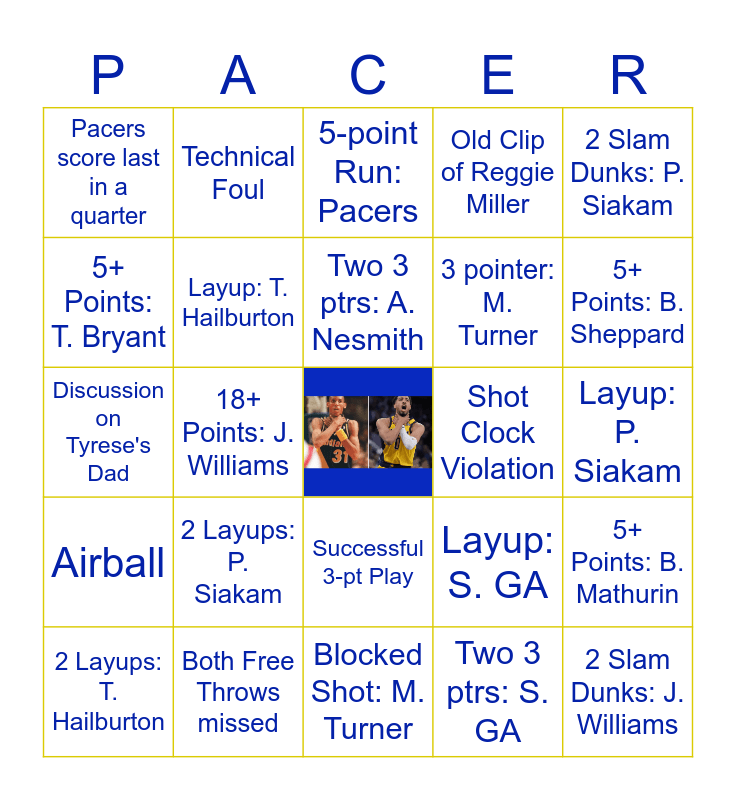 This bingo card has a free space and 87 words: 10-point Run: Pacers, 25+ Points: S. GA, Successful 3-pt Play, 2 Blocked Shots: C. Holmgren, 3 pointer: T. Haliburton, 5+ Rebounds: M. Turner, 6+ Assists: S. GA, Thunder score last in a quarter, Slam Dunk: T. Hailburton, 2 Layups: C. Holmgren, 5+ Points: T. McConnell, 5+ Points: O. Toppin, 5+ Points: B. Mathurin, Layup: P. Siakam, Foul Out (6 fouls), Two 3 ptrs: A. Nesmith, Slam Dunk: O. Toppin, Flagrant Foul, Charging Foul, 18+ Points: T. Haliburton, 2 Slam Dunks: C. Holmgren, Old Clip of Kevin Durant, Discussion on Tyrese's Dad, 2 Layups: S. GA, Two 3 ptrs: S. GA, Paul George Trade Discussion, 5-point Run: Thunder, Buzzer-Beater (quarter / shot clock), Two 3 ptrs: M. Turner, 3+ Assist: T. Haliburton, Both Free Throws missed, Coaches’ Challenge: Thunder, Slam Dunk: P. Siakam, 2 Layups: P. Siakam, 5+ Points: T. Bryant, 10-point Run: Thunder, 5+ Points: B. Sheppard, Two 3 ptrs: P. Siakam, Coaches’ Challenge: Pacers, 18+ Points: J. Williams, 2 Slam Dunks: O. Toppin, Layup: J. Williams, Two 3 ptrs: J. Williams, Shot Clock Violation, Baby In Crowd, 2 Slam Dunks: P. Siakam, Thunder score first in a quarter, Technical Foul, Game tied in 4th Quarter, Slam Dunk: J. Williams, Pacers score first in a quarter, 7+ Rebounds: C. Holmgren, Airball, 2 Slam Dunks: M. Turner, 2 Blocked Shots: M. Turner, Alley-Oop Slam Dunk, 3 pointer: M. Turner, Two 3 ptrs: T. Haliburton, Halftime Lead: Pacers, Old Clip of Reggie Miller, Layup: T. Hailburton, 5+ Points: A. Nembard, 20+ Points: P. Siakam, 2+ Assists: T. McConnell, 2 Slam Dunks: S. GA, Slam Dunk: M. Turner, 3+ Assists: S. GA, 2 Layups: T. Hailburton, 2 Slam Dunks: J. Williams, Slam Dunk: C. Holmgren, Halftime Lead: Thunder, 3 pointer: A. Nesmith, 5-point Run: Pacers, Layup: S. GA, Slam Dunk: S. GA, 2 Layups: J. Williams, Layup: M. Turner, Blocked Shot: M. Turner, Layup: C. Holmgren, 3 pointer: J. Williams, 6+ Assist: T. Haliburton, 3 pointer: P. Siakam, 3 pointer: S. GA, Blocked Shot: C. Holmgren, 2 Layups: M. Turner, Pacers score last in a quarter and 2 Slam Dunks: T. Hailburton.