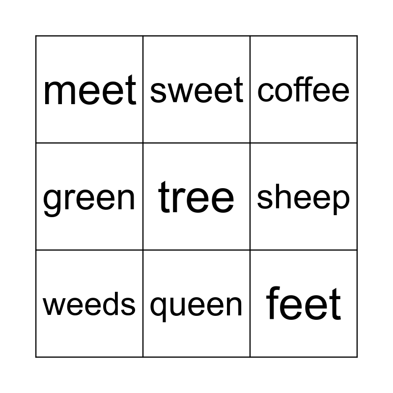This bingo card has 12 words: teeth, feet, tree, sheep, sweet, coffee, queen, three, meet, green, weeds and bee.