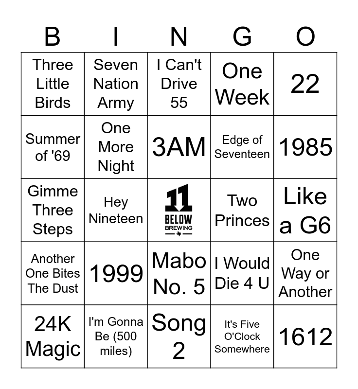 This bingo card has a free space and 24 words: 1999, I'm Gonna Be (500 miles), 3AM, 24K Magic, 22, Three Little Birds, Summer of '69, Seven Nation Army, Two Princes, Mabo No. 5, Edge of Seventeen, Gimme Three Steps, I Would Die 4 U, One Way or Another, One More Night, It's Five O'Clock Somewhere, Like a G6, I Can't Drive 55, 1985, Hey Nineteen, 1612, Another One Bites The Dust, One Week and Song 2.