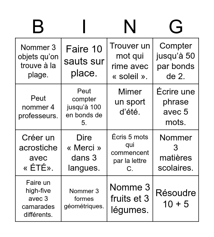 This bingo card has 32 words: Résoudre 4+11, Compter les coins d’un carré., Nommer 3 matières scolaires., Dire l’heure sur une horloge., Résoudre 10 + 5, Mimer un sport d’été., Peut nommer 4 professeurs., Trouver un mot qui commence par la même lettre que son prénom., Faire 10 sauts sur place., Nommer un objet plus grand qu’un livre., Écrire une phrase avec 5 mots., Trouver un mot qui rime avec « soleil »., Dire un compliment à un camarade., Écrire 3 mots qui commencent par « B »., Nommer 3 formes géométriques., Écrire les nombres de 1 à 10 en lettres., Nomme 4 animaux qui vivent dans l’eau., Écris 5 mots qui commencent par la lettre C., Trouve un mot qui rime avec « chat »., Écris les jours de la semaine dans l’ordre., Écris 3 mots qui ont la lettre P dedans., Tiens en équilibre sur un pied pendant 15 secondes., Nomme 3 fruits et 3 légumes., Trouver un nombre pair entre 1 et 10., Faire un high-five avec 3 camarades différents., Compter jusqu’à 50 par bonds de 2., Créer un acrostiche avec « ÉTÉ»., Peut compter jusqu’à 100 en bonds de 5., Nommer 3 objets qu’on trouve à la plage., Raconter un souvenir d’école., Compter à rebours de 20 à 0. and Dire « Merci » dans 3 langues..