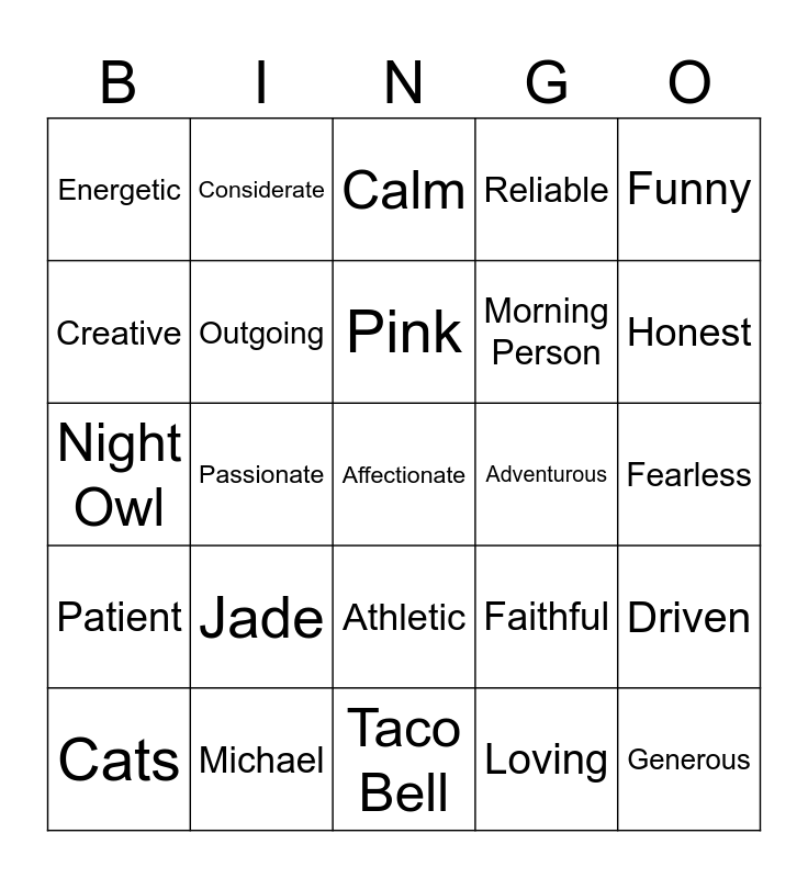 This bingo card has a free space and 24 words: Jade, Michael, Pink, Cats, Funny, Energetic, Creative, Considerate, Adventurous, Athletic, Morning Person, Night Owl, Faithful, Driven, Outgoing, Loving, Fearless, Calm, Honest, Passionate, Generous, Patient, Reliable and Taco Bell.