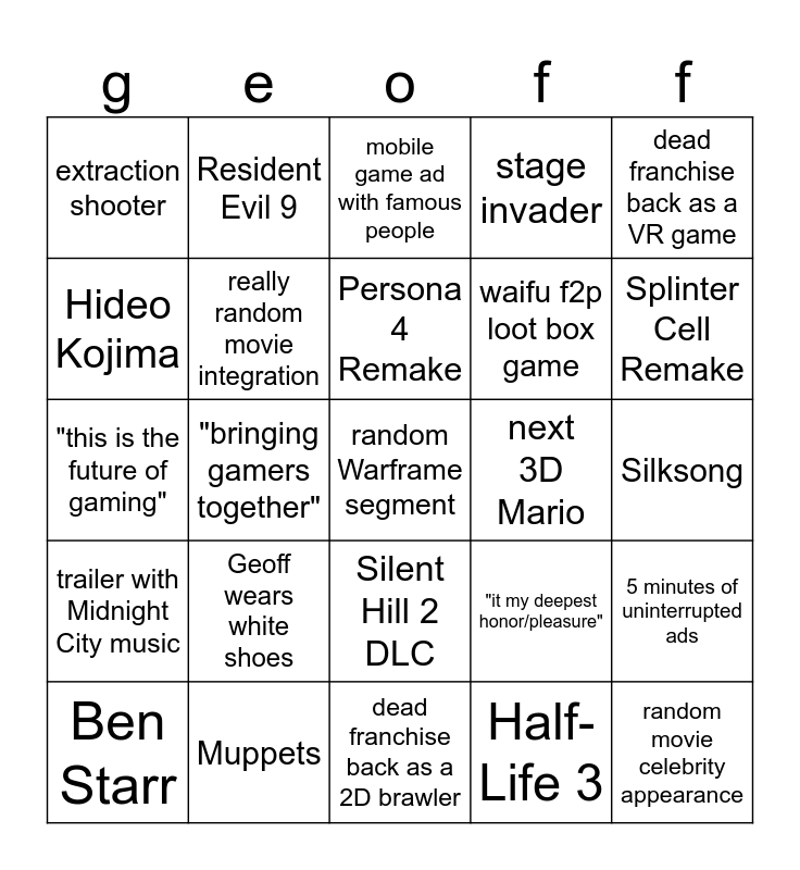 This bingo card has a free space and 24 words: Geoff wears white shoes, Muppets, Persona 4 Remake, Ben Starr, dead franchise back as a VR game, extraction shooter, Hideo Kojima, Resident Evil 9, next 3D Mario, Silent Hill 2 DLC, waifu f2p loot box game, "this is the future of gaming", "it my deepest honor/pleasure", 5 minutes of uninterrupted ads, really random movie integration, Half-Life 3, Silksong, mobile game ad with famous people, Splinter Cell Remake, "bringing gamers together", random movie celebrity appearance, trailer with Midnight City music, stage invader and dead franchise back as a 2D brawler.