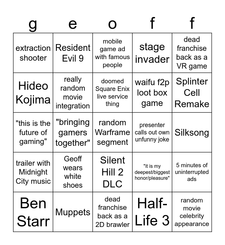 This bingo card has a free space and 24 words: Geoff wears white shoes, Muppets, doomed Square Enix live service thing, Ben Starr, dead franchise back as a VR game, extraction shooter, Hideo Kojima, Resident Evil 9, presenter calls out own unfunny joke, Silent Hill 2 DLC, waifu f2p loot box game, "this is the future of gaming", "it is my deepest/biggest honor/pleasure", 5 minutes of uninterrupted ads, really random movie integration, Half-Life 3, Silksong, mobile game ad with famous people, Splinter Cell Remake, "bringing gamers together", random movie celebrity appearance, trailer with Midnight City music, stage invader and dead franchise back as a 2D brawler.