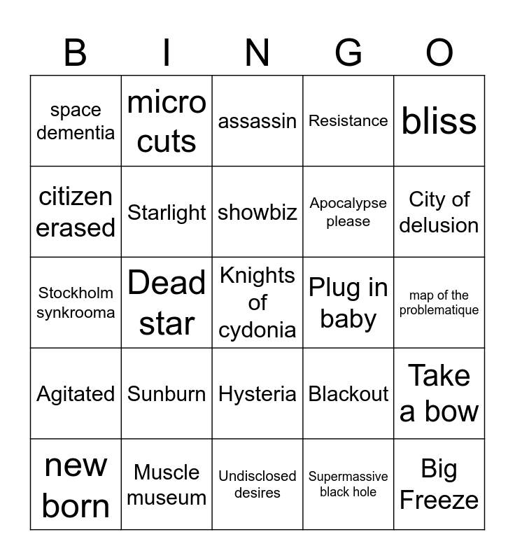 This bingo card has a free space and 24 words: Sunburn, Muscle museum, showbiz, new born, bliss, space dementia, citizen erased, micro cuts, Plug in baby, Hysteria, Apocalypse please, Stockholm synkrooma, Blackout, Take a bow, Starlight, Supermassive black hole, map of the problematique, assassin, City of delusion, Dead star, Big Freeze, Agitated, Resistance and Undisclosed desires.