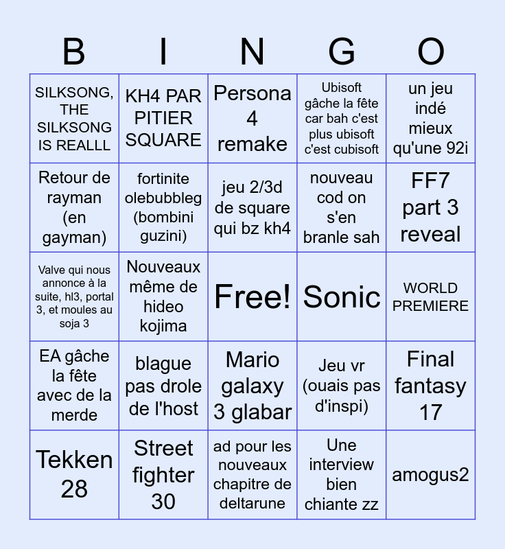This bingo card has a free space and 24 words: blague pas drole de l'host, Street fighter 30, jeu 2/3d de square qui bz kh4, Tekken 28, un jeu indé mieux qu'une 92i, SILKSONG, THE SILKSONG IS REALLL, Retour de rayman (en gayman), KH4 PAR PITIER SQUARE, Sonic, Mario galaxy 3 glabar, nouveau cod on s'en branle sah, Valve qui nous annonce à la suite, hl3, portal 3, et moules au soja 3, Jeu vr (ouais pas d'inspi), Final fantasy 17, fortinite olebubbleg (bombini guzini), Une interview bien chiante zz, WORLD PREMIERE, Persona 4 remake, FF7 part 3 reveal, Nouveaux même de hideo kojima, amogus2, EA gâche la fête avec de la merde, Ubisoft gâche la fête car bah c'est plus ubisoft c'est cubisoft and ad pour les nouveaux chapitre de deltarune.