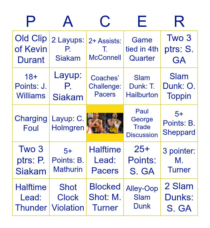 This bingo card has a free space and 87 words: Pacers score last in a quarter, 6+ Assist: T. Haliburton, Halftime Lead: Pacers, Slam Dunk: J. Williams, 2 Slam Dunks: O. Toppin, Layup: J. Williams, 2 Slam Dunks: M. Turner, 3 pointer: P. Siakam, Thunder score first in a quarter, 7+ Rebounds: C. Holmgren, Airball, 3 pointer: T. Haliburton, 3 pointer: M. Turner, 5+ Points: B. Sheppard, Old Clip of Reggie Miller, Coaches’ Challenge: Pacers, 2 Slam Dunks: C. Holmgren, Slam Dunk: S. GA, 18+ Points: T. Haliburton, 2 Layups: C. Holmgren, 5+ Points: T. Bryant, 2 Slam Dunks: J. Williams, Charging Foul, 10-point Run: Pacers, Alley-Oop Slam Dunk, 5-point Run: Thunder, Two 3 ptrs: A. Nesmith, Coaches’ Challenge: Thunder, Both Free Throws missed, 2 Blocked Shots: M. Turner, Shot Clock Violation, 3+ Assist: T. Haliburton, Discussion on Tyrese's Dad, 5+ Points: B. Mathurin, 18+ Points: J. Williams, 2 Slam Dunks: P. Siakam, Slam Dunk: O. Toppin, Foul Out (6 fouls), Successful 3-pt Play, Layup: C. Holmgren, 5+ Rebounds: M. Turner, Flagrant Foul, 3 pointer: J. Williams, Paul George Trade Discussion, 2 Layups: M. Turner, Two 3 ptrs: S. GA, Two 3 ptrs: J. Williams, 2 Layups: P. Siakam, Layup: S. GA, Technical Foul, Thunder score last in a quarter, 20+ Points: P. Siakam, Two 3 ptrs: P. Siakam, 2 Blocked Shots: C. Holmgren, 5+ Points: A. Nembard, 5-point Run: Pacers, Slam Dunk: T. Hailburton, Layup: M. Turner, 5+ Points: O. Toppin, Game tied in 4th Quarter, Layup: P. Siakam, 5+ Points: T. McConnell, Blocked Shot: C. Holmgren, 3 pointer: A. Nesmith, Layup: T. Hailburton, Slam Dunk: M. Turner, 2 Layups: J. Williams, Halftime Lead: Thunder, 2 Slam Dunks: S. GA, Baby In Crowd, Pacers score first in a quarter, 2 Layups: S. GA, 2+ Assists: T. McConnell, 25+ Points: S. GA, Two 3 ptrs: M. Turner, 2 Layups: T. Hailburton, 3+ Assists: S. GA, Blocked Shot: M. Turner, Slam Dunk: C. Holmgren, 10-point Run: Thunder, 6+ Assists: S. GA, Slam Dunk: P. Siakam, Two 3 ptrs: T. Haliburton, Buzzer-Beater (quarter / shot clock), 3 pointer: S. GA, Old Clip of Kevin Durant and 2 Slam Dunks: T. Hailburton.