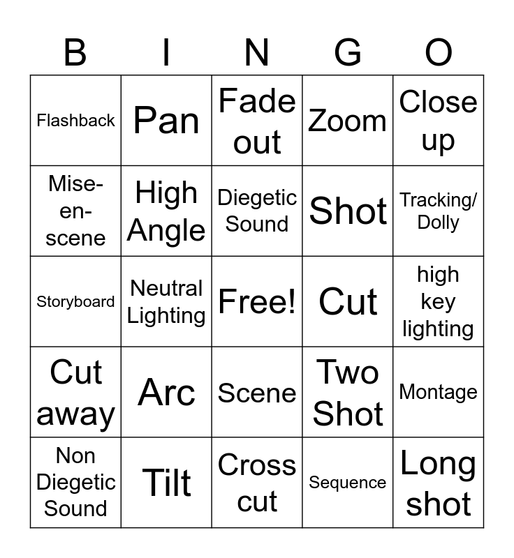 This bingo card has a free space and 24 words: Arc, Tilt, Diegetic Sound, Non Diegetic Sound, Close up, Flashback, Mise- en- scene, Pan, Cut, Scene, Shot, Storyboard, Two Shot, Montage, High Angle, Sequence, high key lighting, Fade out, Tracking/ Dolly, Neutral Lighting, Long shot, Cut away, Zoom and Cross cut.