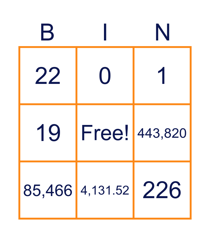 This bingo card has a free space and 8 words: 443,820, 1, 0, 85,466, 22, 226, 19 and 4,131.52.