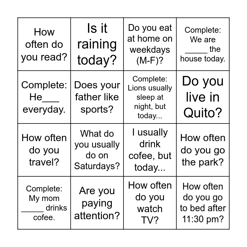 This bingo card has 25 words: Uses of Simple Present, Spelling of verbs in Simple Present, Do you live in Quito?, How often do you dance?, Complete: He___ everyday., How often do you read?, Does your father like sports?, Is it raining today?, Are you paying attention?, How often do yo exercise?, How often do you travel?, I usually drink cofee, but today..., How often do you listen to music?, Are they studying for the test?, Complete: Lions usually sleep at night, but today..., Uses of Present Continuous, How often do you watch TV?, Do you eat at home on weekdays (M-F)?, What do you usually do on Saturdays?, How often do you go the park?, Complete: My mom _____ drinks cofee., Complete: I am _____ a bike., How often do you go to bed after 11:30 pm?, Complete: We are _____ the house today. and Do you go to the cinema at the weekends?.