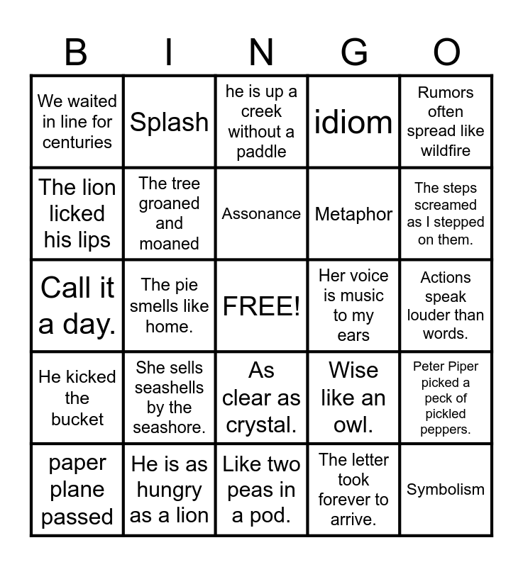This bingo card has a free space and 59 words: Onomatopoeia, He is as hungry as a lion, Simile, He kicked the bucket, The letter took forever to arrive., It took him two seconds to get here, The tree groaned and moaned, Sizzle, Metaphor, Hyperbole, idiom, She is a scaredy cat, The lion licked his lips, Alliteration, Imagery, We waited in line for centuries, Symbolism, Rumors often spread like wildfire, it was raining cats and dogs, Assonance, Her voice is music to my ears, he is up a creek without a paddle, paper plane passed, Peter Piper picked a peck of pickled peppers., That's just the tip of the iceberg., Break a leg., The trees were a wall of green., The haunted house was a portal into another realm., The steps screamed as I stepped on them., The dress was begging for me to buy it., I'm dying of laughter., It's going to take years to finish this., Boom, Bang, Splash, Pale as a ghost., The air was warm and sweet., The pie smells like home., Bite the bullet., Call it a day., I could feel the anxiety balling up in my stomach., She sells seashells by the seashore., Actions speak louder than words., Meow, Beep, The wind howled., Lightning danced across the sky., Hit the sack., As clear as crystal., Like two peas in a pod., She has a heart of gold., I have a mountain of homework., Quack, Once in a blue moon., Let the cat out of the bag., Wise like an owl., As graceful as a swan., In a while crocodile and Winner winner chicken dinner.