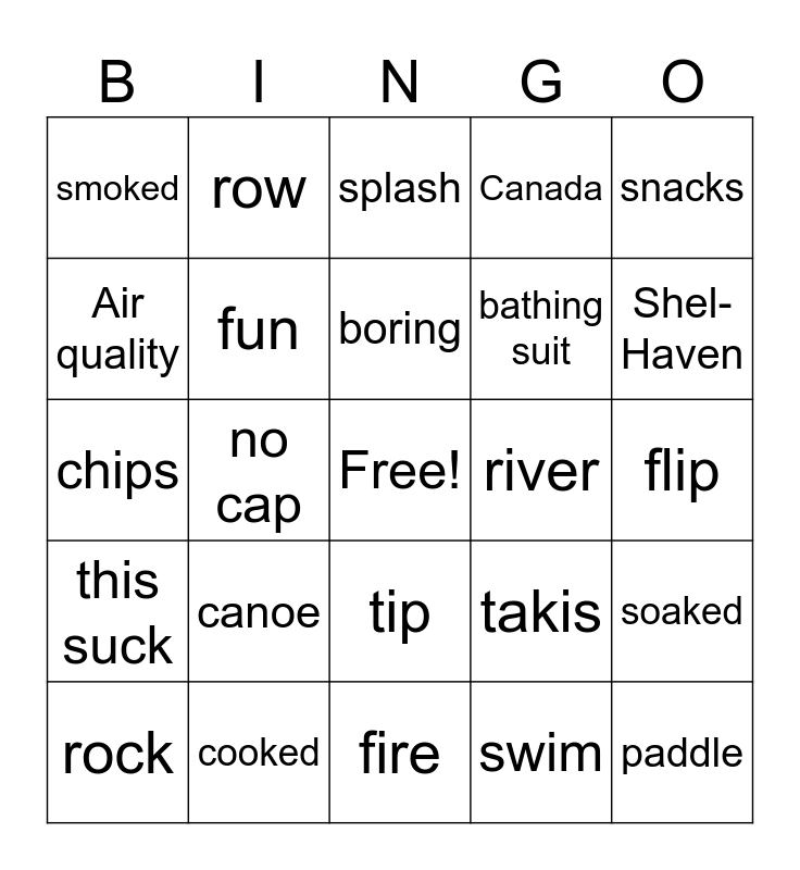 This bingo card has a free space and 24 words: canoe, cooked, boring, rock, snacks, smoked, Air quality, row, river, tip, bathing suit, chips, takis, soaked, fun, swim, flip, splash, Shel-Haven, no cap, paddle, this suck, Canada and fire.