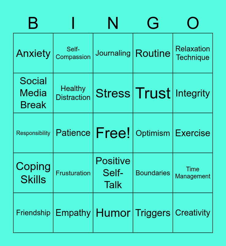 This bingo card has a free space and 24 words: Frusturation, Empathy, Stress, Friendship, Relaxation Technique, Anxiety, Social Media Break, Self-Compassion, Optimism, Positive Self-Talk, Trust, Responsibility, Boundaries, Time Management, Healthy Distraction, Triggers, Exercise, Journaling, Integrity, Patience, Creativity, Coping Skills, Routine and Humor.