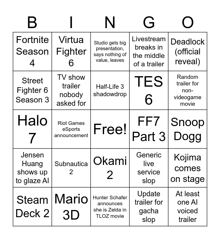 This bingo card has a free space and 24 words: Subnautica 2, Mario 3D, Half-Life 3 shadowdrop, Steam Deck 2, Deadlock (official reveal), Fortnite Season 4, Street Fighter 6 Season 3, Virtua Fighter 6, FF7 Part 3, Okami 2, TES 6, Halo 7, Generic live service slop, Kojima comes on stage, TV show trailer nobody asked for, Update trailer for gacha slop, Snoop Dogg, Studio gets big presentation, says nothing of value, leaves, Random trailer for non-videogame movie, Riot Games eSports announcement, At least one AI voiced trailer, Jensen Huang shows up to glaze AI, Livestream breaks in the middle of a trailer and Hunter Schafer announces she is Zelda in TLOZ movie.