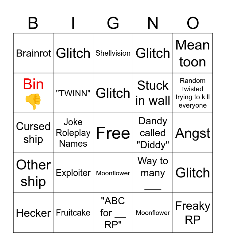 This bingo card has a free space and 29 words: Hecker, Rodger and Toodles, Joke Roleplay Names, Non-roleplayer, Brainrot, Shellvision, "TWINN", Exploiter, Dandy called "Diddy", Fruitcake, Angst, Freaky RP, "ABC for __ RP", Moonflower, Random twisted trying to kill everyone, Detailed RP, Moonflower, Other ship, Mean toon, Cursed ship, Way to many ___, Freaky toon, Stuck in wall, Bin👎, Glitch, Glitch, Glitch, Glitch and Glitch.
