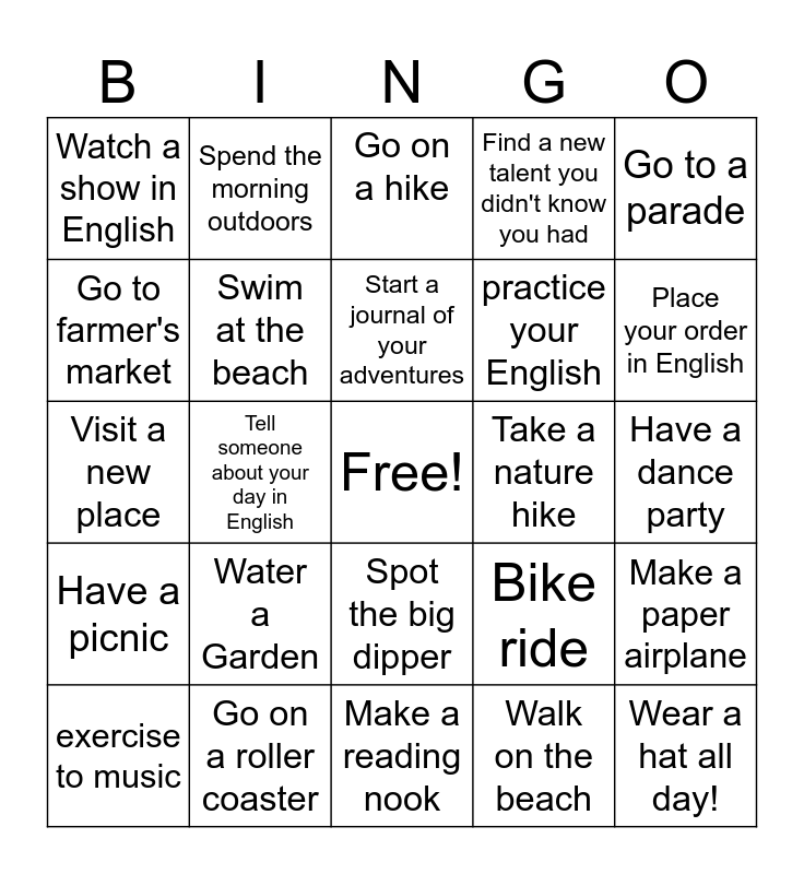 This bingo card has a free space and 29 words: exercise to music, Read a book in English, Tell someone about your day in English, Go fishing, Watch a show in English, Go on a hike, Swim at the beach, Water a Garden, Take a nature hike, Go on a roller coaster, Have a dance party, Wear a hat all day!, Make a reading nook, Walk on the beach, Place your order in English, eat icecream, Spot the big dipper, Have a picnic, Go to a parade, Visit a new place, Bike ride, go to a baseball game, practice your English, Go to farmer's market, Find a new talent you didn't know you had, Spend the morning outdoors, Make a paper airplane, Start a journal of your adventures and Make a puppet and put on a show.
