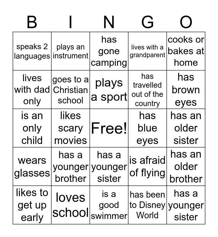 This bingo card has a free space and 24 words: has a younger brother, loves school, plays a sport, likes to get up early, cooks or bakes at home, speaks 2 languages, lives with dad only, plays an instrument, has blue eyes, has a younger sister, has travelled out of the country, is an only child, is afraid of flying, has an older brother, goes to a Christian school, has been to Disney World, has an older sister, has gone camping, has brown eyes, likes scary movies, has a younger sister, wears glasses, lives with a grandparent and is a good swimmer.