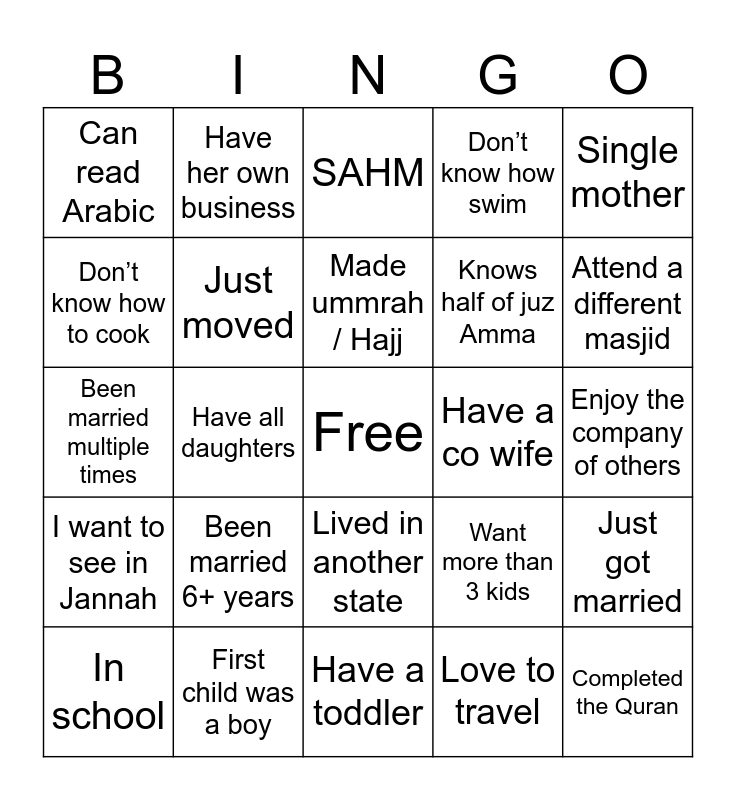 This bingo card has a free space and 24 words: Been married 6+ years, First child was a boy, Made ummrah / Hajj, In school, Single mother, Can read Arabic, Don’t know how to cook, Have her own business, Have a co wife, Lived in another state, Knows half of juz Amma, Been married multiple times, Want more than 3 kids, Just got married, Just moved, Love to travel, Enjoy the company of others, SAHM, Attend a different masjid, Have all daughters, Completed the Quran, I want to see in Jannah, Don’t know how swim and Have a toddler.