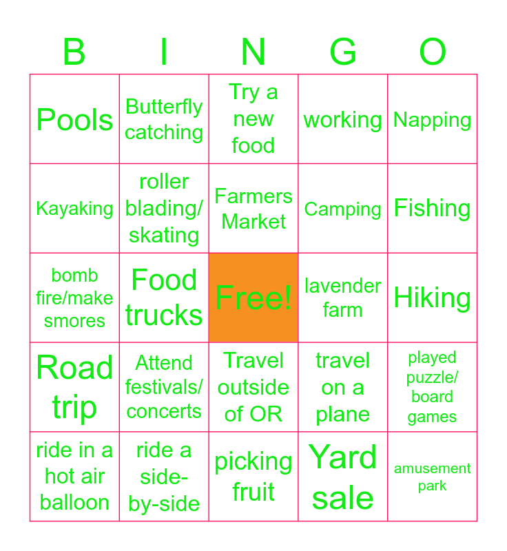 This bingo card has a free space and 67 words: Beach trip, Picnic, Chased by mosquitos, played puzzle/ board games, Sun bathing, play with chalk, Butterfly catching, Park, Farmers Market, Eat watermelon, Travel outside of OR, watch a sports game, Hiking, Napping, Dropped an ice cream cone, Kayaking, Food trucks, Pools, play sports, Camping, Attend festivals/ concerts, Road trip, working, Yard sale, Sleep with windows open, get a carwash, read a book, getting new pet, Fishing, watermelon fight, amusement park, get a new look, get a pedicure, start a garden, mow the lawn, ride in a hot air balloon, sky diving, travel on a plane, bomb fire/make smores, watch sunset /sunrise, biking, roller blading/ skating, lavender farm, evening walk, water balloon fight, do a cartwheel, go to a lake, ride a side-by-side, Movie marathon, draw/color, Try a new food, fly a kite, Jump rope, play video game/s, watch fireworks, picking fruit, horseback riding, tie-dye, try new recipe, visit family, visit friends, bbq, nerf gun fight, Had a snow cone, went to drive-in, chased by bees and made a craft.
