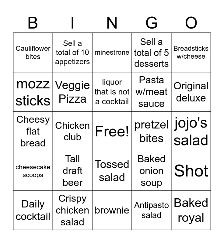 This bingo card has a free space and 29 words: Daily cocktail, 3 chocolate chunk cookies, Chicken club, bottle of beer, Cauliflower bites, minestrone, Veggie Pizza, Tall draft beer, pretzel bites, Crispy chicken salad, jojo's salad, Baked royal, brownie, Antipasto salad, Original deluxe, Glass of wine, Tossed salad, cheesecake scoops, Breadsticks w/cheese, Cheesy flat bread, Baked onion soup, Grilled Chicken salad, Pasta w/meat sauce, mozz sticks, Sell a total of 5 desserts, Sell a total of 10 appetizers, Shot, liquor that is not a cocktail and bucket of beer.