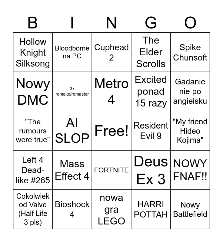 This bingo card has a free space and 24 words: Mass Effect 4, Bioshock 4, Metro 4, Cokolwiek od Valve (Half Life 3 pls), Spike Chunsoft, Hollow Knight Silksong, Nowy DMC, Bloodborne na PC, Resident Evil 9, FORTNITE, Excited ponad 15 razy, "The rumours were true", Deus Ex 3, NOWY FNAF!!, 3x remake/remaster, HARRI POTTAH, "My friend Hideo Kojima", Cuphead 2, Gadanie nie po angielsku, AI SLOP, Nowy Battlefield, Left 4 Dead-like #265, The Elder Scrolls and nowa gra LEGO.