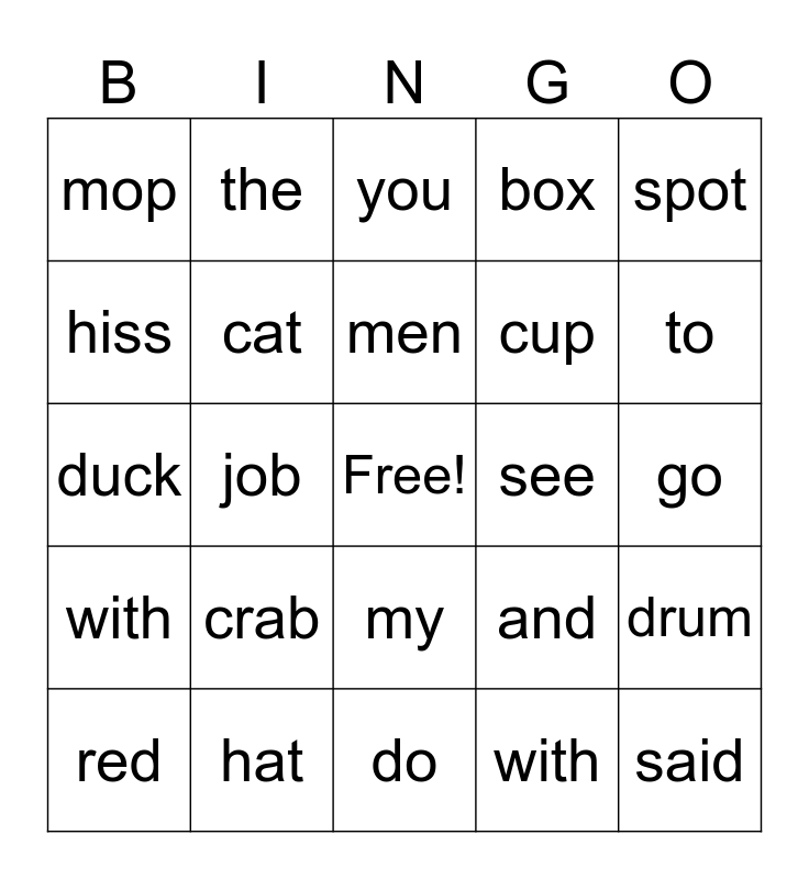 This bingo card has a free space and 24 words: crab, hat, men, red, spot, mop, hiss, the, see, my, cup, duck, and, drum, cat, with, go, you, to, job, said, with, box and do.