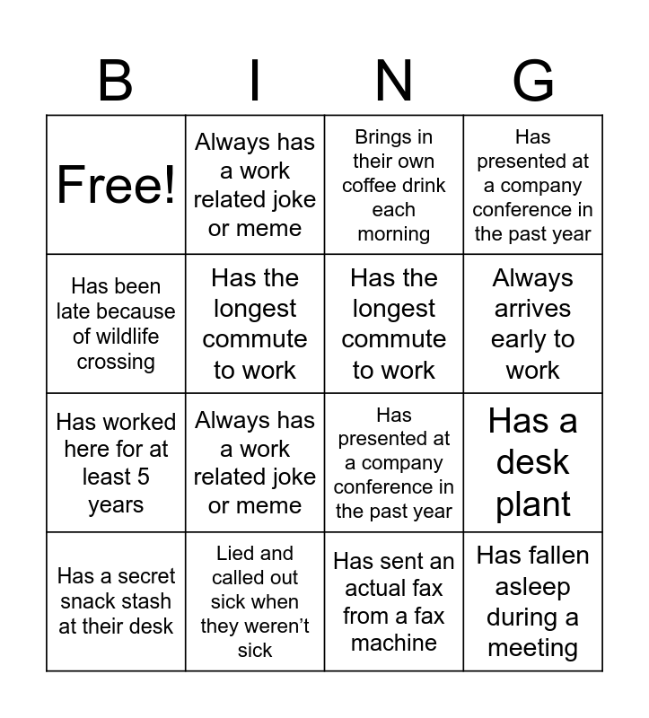 This bingo card has 33 words: Has been late because of wildlife crossing, Lied and called out sick when they weren’t sick, Has sent an actual fax from a fax machine, Has fallen asleep during a meeting, Has a secret snack stash at their desk, Always has a work related joke or meme, Brings in their own coffee drink each morning, Has changed careers, Free!, Has worked here for at least 5 years, Has the longest commute to work, Has presented at a company conference in the past year, Always arrives early to work, Has a desk covered in sticky note reminders, Is always willing to help a coworker or answer a question, Has a desk plant, Has zero unread emails, Has been late because of wildlife crossing, Lied and called out sick when they weren’t sick, Has sent an actual fax from a fax machine, Has fallen asleep during a meeting, Has a secret snack stash at their desk, Always has a work related joke or meme, Brings in their own coffee drink each morning, Has changed careers, Has worked here for at least 5 years, Has the longest commute to work, Has presented at a company conference in the past year, Always arrives early to work, Has a desk covered in sticky note reminders, Is always willing to help a coworker or answer a question, Has a desk plant and Has zero unread emails.