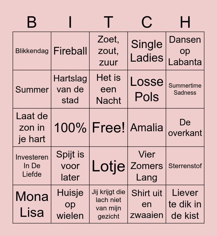 This bingo card has a free space and 29 words: Mona Lisa, Echte Liefde Is Te Koop, 100%, Sugar Daddy, Blikkendag, Zoet, zout, zuur, Hartslag van de stad, Spijt is voor later, Amalia, Huisje op wielen, De overkant, Liever te dik in de kist, Jij krijgt die lach niet van mijn gezicht, Shirt uit en zwaaien, Summertime Sadness, Dromendans, Lotje, Investeren In De Liefde, Dansen op Labanta, Laat de zon in je hart, Vier Zomers Lang, Noodgeval, Losse Pols, Summer, Single Ladies, Fireball, Sterrenstof, Het is een Nacht and Brabant.