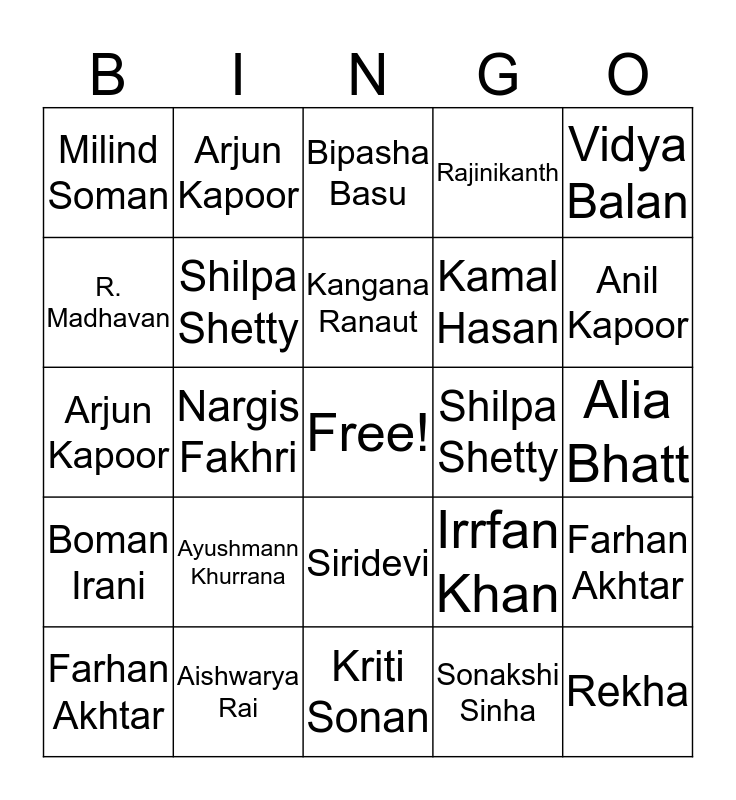 This bingo card has a free space and 32 words: Sonakshi Sinha, Madhubala, Nargis Fakhri, Sidharth Malhotra, Boman Irani, Shilpa Shetty, Vidya Balan, Farhan Akhtar, Arjun Kapoor, Abhishek Bachchan, Kangana Ranaut, Bipasha Basu, John Abraham, Sidharth Malhotra, Shilpa Shetty, Vidya Balan, Farhan Akhtar, Arjun Kapoor, Siridevi, Ayushmann Khurrana, Irrfan Khan, Parineeti Chopra, Alia Bhatt, Aishwarya Rai, Rekha, Rajinikanth, Kamal Hasan, R. Madhavan, Milind Soman, Kriti Sonan, Ileana D’Cruz and Anil Kapoor.