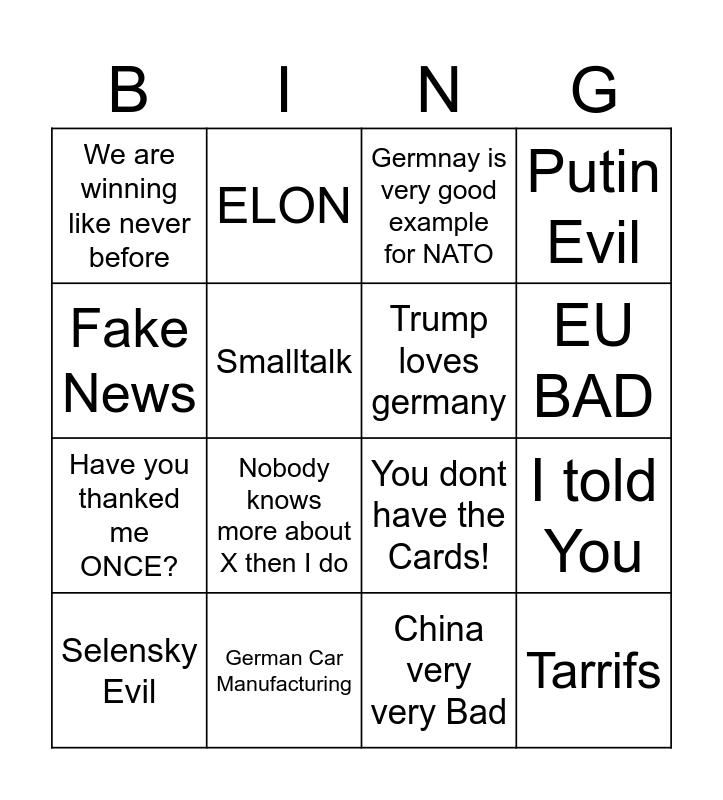 This bingo card has 16 words: German Car Manufacturing, I told You, Germnay is very good example for NATO, We are winning like never before, Have you thanked me ONCE?, ELON, You dont have the Cards!, China very very Bad, Fake News, Smalltalk, Selensky Evil, Putin Evil, Nobody knows more about X then I do, EU BAD, Trump loves germany and Tarrifs.