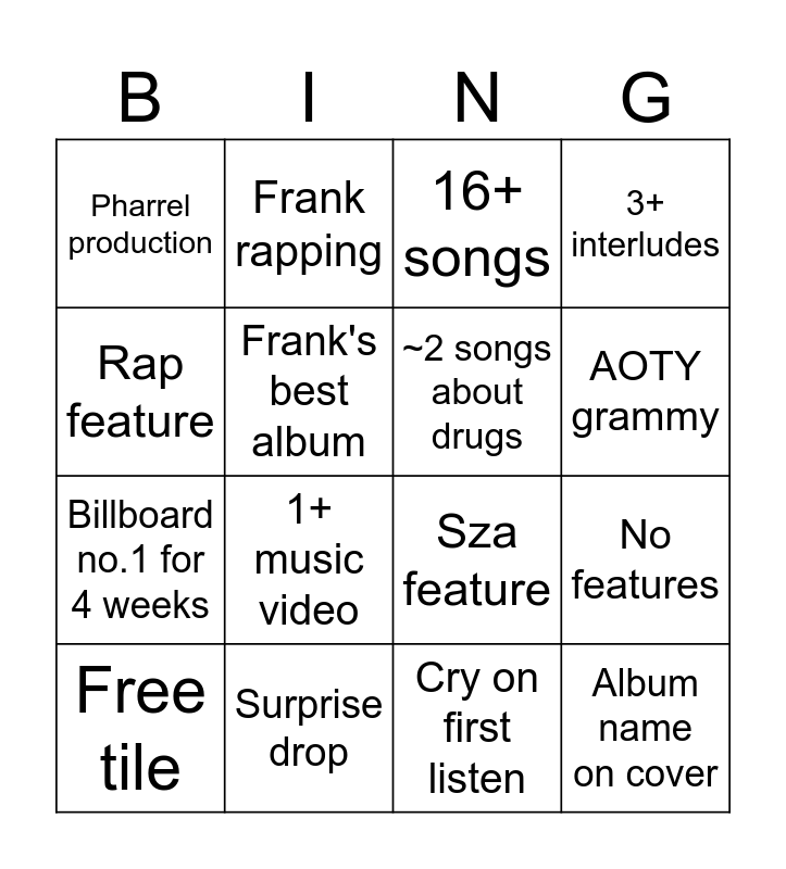 This bingo card has 16 words: Surprise drop, No features, 16+ songs, Pharrel production, Billboard no.1 for 4 weeks, Frank rapping, Sza feature, Cry on first listen, Rap feature, Frank's best album, Free tile, 3+ interludes, 1+ music video, AOTY grammy, ~2 songs about drugs and Album name on cover.