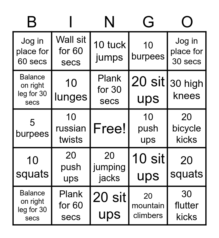 This bingo card has a free space and 24 words: 20 push ups, Plank for 60 secs, Plank for 30 secs, Balance on right leg for 30 secs, Jog in place for 30 secs, Jog in place for 60 secs, Balance on right leg for 30 secs, Wall sit for 60 secs, 10 push ups, 20 jumping jacks, 20 sit ups, 5 burpees, 10 sit ups, 20 squats, 10 lunges, 20 mountain climbers, 20 bicycle kicks, 10 tuck jumps, 30 high knees, 10 russian twists, 30 flutter kicks, 10 squats, 10 burpees and 20 sit ups.