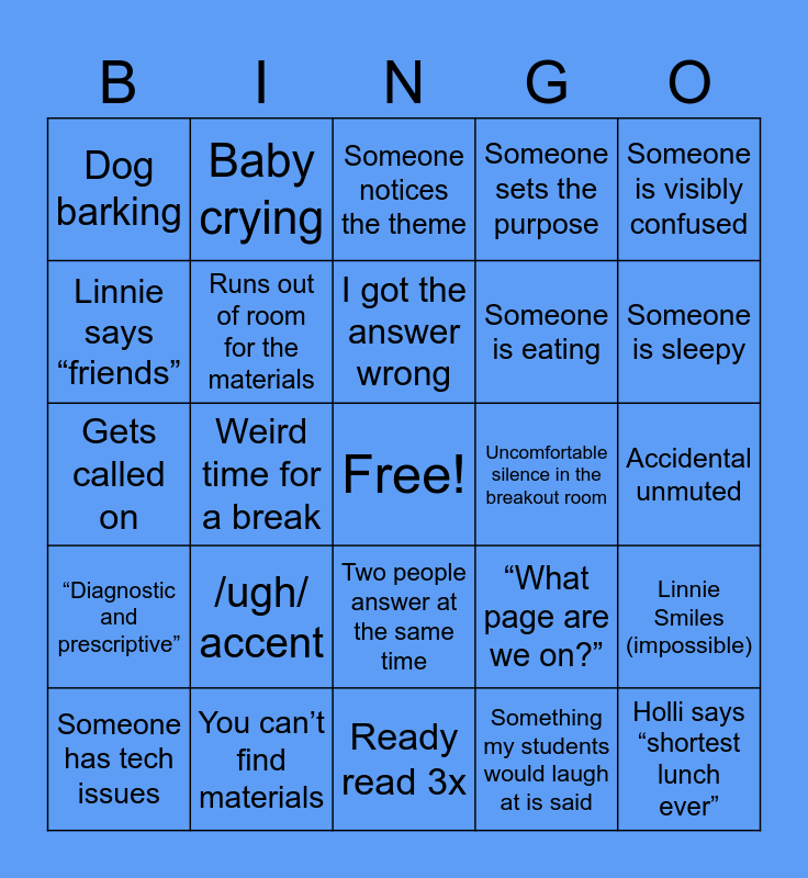 This bingo card has a free space and 24 words: /ugh/ accent, You can’t find materials, I got the answer wrong, Someone has tech issues, Someone is visibly confused, Dog barking, Linnie says “friends”, Baby crying, Uncomfortable silence in the breakout room, Two people answer at the same time, Someone is eating, Gets called on, “What page are we on?”, Linnie Smiles (impossible), Runs out of room for the materials, Something my students would laugh at is said, Accidental unmuted, Someone notices the theme, Someone is sleepy, Weird time for a break, Holli says “shortest lunch ever”, “Diagnostic and prescriptive”, Someone sets the purpose and Ready read 3x.
