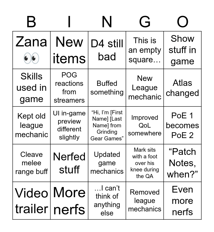 This bingo card has a free space and 24 words: Nerfed stuff, More nerfs, Buffed something, Video trailer, Show stuff in game, Zana 👀, Skills used in game, New items, Improved QoL somewhere, Updated game mechanics, New League mechanic, Kept old league mechanic, Mark sits with a foot over his knee during the QA, “Patch Notes, when?”, POG reactions from streamers, Removed league mechanics, PoE 1 becomes PoE 2, D4 still bad, Atlas changed, UI in-game preview different slightly, Even more nerfs, Cleave melee range buff, This is an empty square… and …I can’t think of anything else.