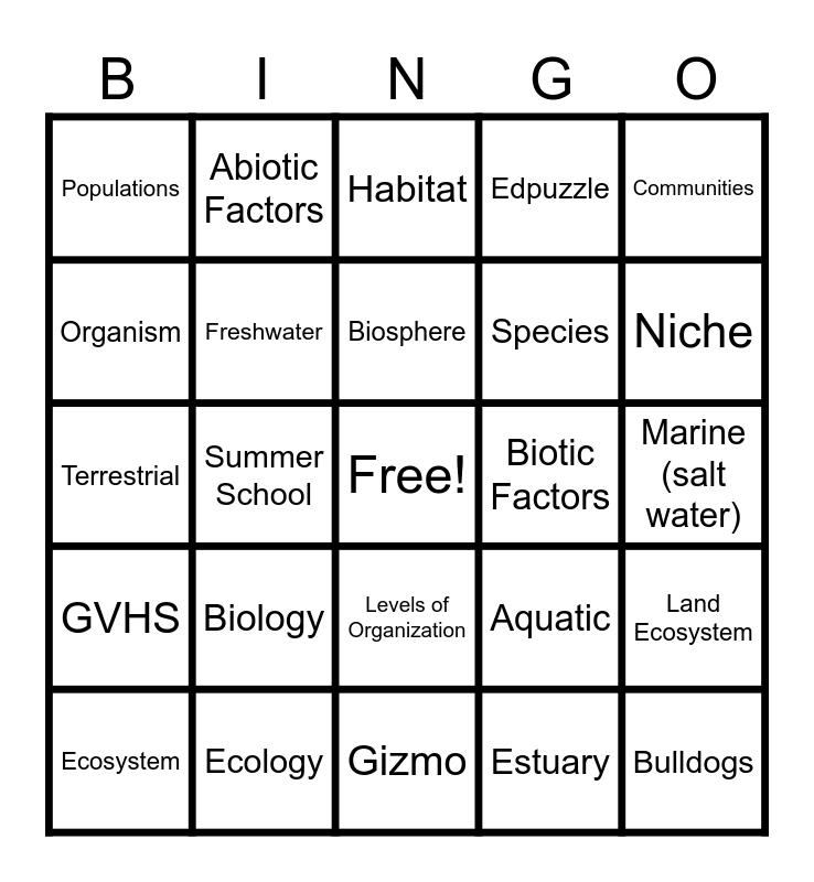 This bingo card has a free space and 24 words: Biology, Ecology, Biosphere, Ecosystem, Communities, Populations, Organism, Abiotic Factors, Biotic Factors, Levels of Organization, Species, Terrestrial, Aquatic, Land Ecosystem, Freshwater, Estuary, Marine (salt water), Habitat, Niche, Summer School, Bulldogs, GVHS, Edpuzzle and Gizmo.