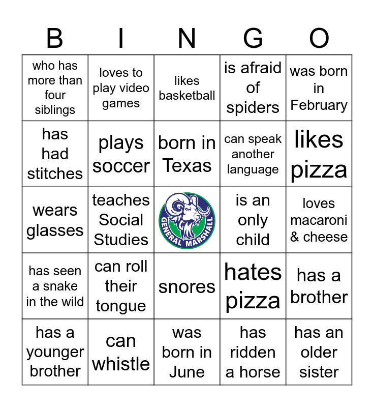 This bingo card has a free space and 54 words: enjoys math, has seen a snake in the wild, likes spicy food, bites his/her fingernails, snores, does not like broccoli, is afraid of spiders, can play a musical instrument, has had stitches, loves to swim, who has more than four siblings, can use chopsticks, can whistle, has a younger brother, is left-handed, was born in June, has an older sister, can speak another language, plays football, loves macaroni & cheese, hates pizza, has curly hair, is an only child, was born in February, has never been on an airplane, loves to play video games, has a pet dog, loves to dance, has a pet cat, has ridden a horse, plays a musical instrument, has a sister, born in Austin, has blue eyes, likes basketball, teaches English, wears glasses, has a brother, is multilingual, plays soccer, likes anime, has brown hair, has traveled to another country, likes to read, can roll their tongue, has long hair, teaches Science, knows the ASL alphabet, born in Texas, teaches Social Studies, likes pizza, born outside Texas, teaches Math and teaches band or art.