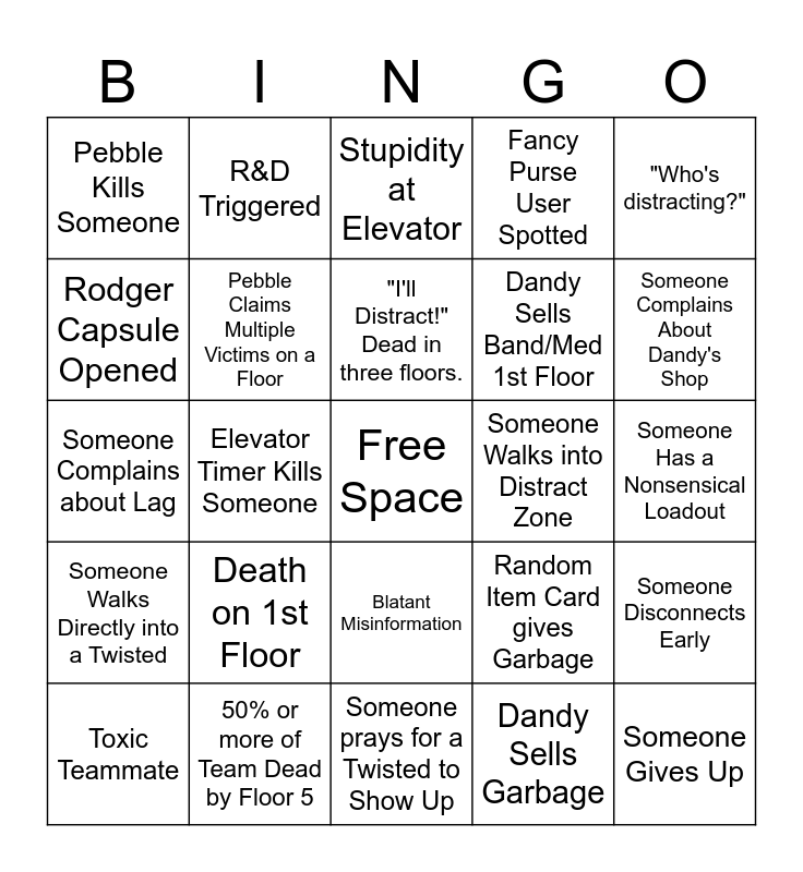This bingo card has a free space and 24 words: Death on 1st Floor, 50% or more of Team Dead by Floor 5, "I'll Distract!" Dead in three floors., Toxic Teammate, "Who's distracting?", Pebble Kills Someone, Rodger Capsule Opened, R&D Triggered, Someone Walks into Distract Zone, Blatant Misinformation, Dandy Sells Band/Med 1st Floor, Someone Complains about Lag, Random Item Card gives Garbage, Someone Disconnects Early, Pebble Claims Multiple Victims on a Floor, Dandy Sells Garbage, Someone Has a Nonsensical Loadout, Stupidity at Elevator, Someone Complains About Dandy's Shop, Elevator Timer Kills Someone, Someone Gives Up, Someone Walks Directly into a Twisted, Fancy Purse User Spotted and Someone prays for a Twisted to Show Up.