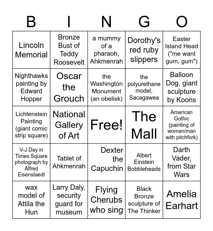 This bingo card has a free space and 24 words: Tablet of Ahkmenrah, Larry Daly, security guard for museum, the Washington Monument (an obelisk), wax model of Attila the Hun, Easter Island Head ("me want gum, gum"), Lincoln Memorial, Nighthawks painting by Edward Hopper, Bronze Bust of Teddy Roosevelt, The Mall, Dexter the Capuchin, the polyurethane model, Sacagawea, Lichtenstein Painting (giant comic strip square), Albert Einstein Bobbleheads, Darth Vader, from Star Wars, Oscar the Grouch, Black Bronze sculpture of The Thinker, American Gothic (painting of woman/man with pitchfork), a mummy of a pharaoh, Ahkmenrah, Balloon Dog, giant sculpture by Koons, National Gallery of Art, Amelia Earhart, V-J Day in Times Square photograph by Alfred Eisenstaedt, Dorothy's red ruby slippers and Flying Cherubs who sing.