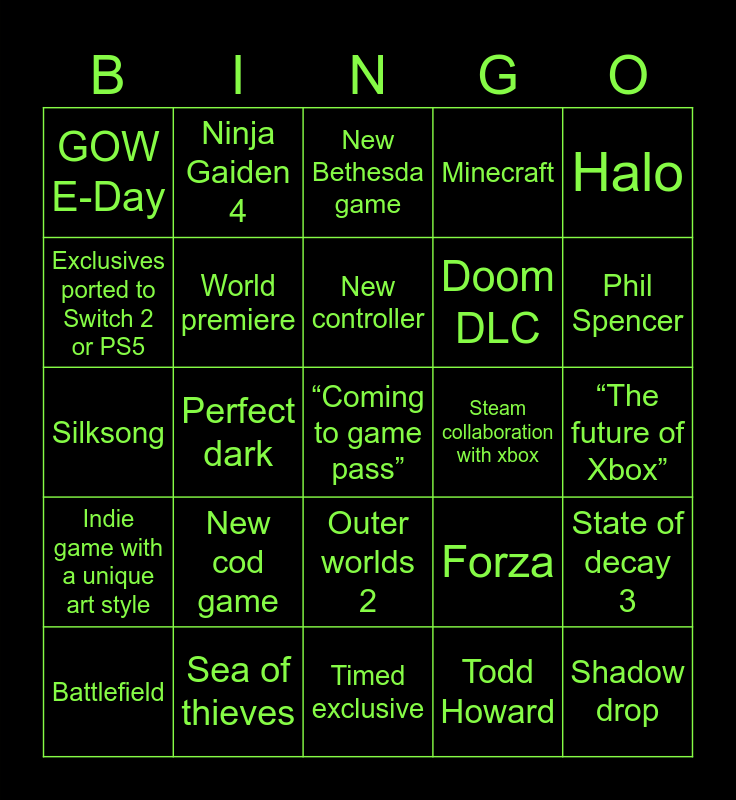 This bingo card has a free space and 24 words: New cod game, Sea of thieves, New controller, Battlefield, Halo, GOW E-Day, Exclusives ported to Switch 2 or PS5, Ninja Gaiden 4, Steam collaboration with xbox, Outer worlds 2, Doom DLC, Silksong, Forza, State of decay 3, World premiere, Todd Howard, “The future of Xbox”, New Bethesda game, Phil Spencer, Perfect dark, Shadow drop, Indie game with a unique art style, Minecraft and Timed exclusive.