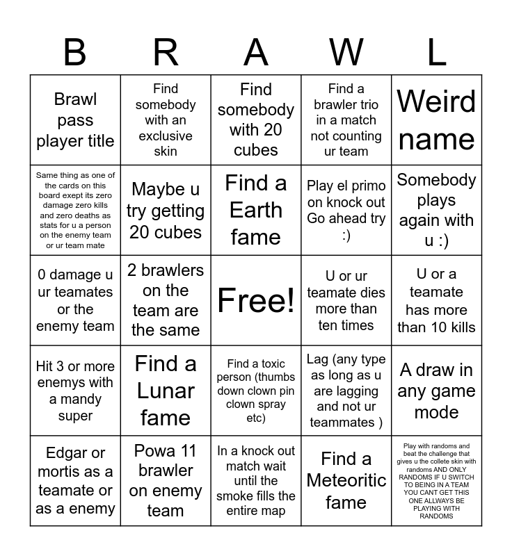 This bingo card has a free space and 24 words: Edgar or mortis as a teamate or as a enemy, Find a Lunar fame, Find a Earth fame, Find a Meteoritic fame, Weird name, Brawl pass player title, Find somebody with an exclusive skin, Find somebody with 20 cubes, U or ur teamate dies more than ten times, U or a teamate has more than 10 kills, 0 damage u ur teamates or the enemy team, Maybe u try getting 20 cubes, Lag (any type as long as u are lagging and not ur teammates ), A draw in any game mode, Same thing as one of the cards on this board exept its zero damage zero kills and zero deaths as stats for u a person on the enemy team or ur team mate, Powa 11 brawler on enemy team, In a knock out match wait until the smoke fills the entire map, Find a brawler trio in a match not counting ur team, Somebody plays again with u :), Hit 3 or more enemys with a mandy super, 2 brawlers on the team are the same, Find a toxic person (thumbs down clown pin clown spray etc), Play el primo on knock out Go ahead try :) and Play with randoms and beat the challenge that gives u the collete skin with randoms AND ONLY RANDOMS IF U SWITCH TO BEING IN A TEAM YOU CANT GET THIS ONE ALLWAYS BE PLAYING WITH RANDOMS.