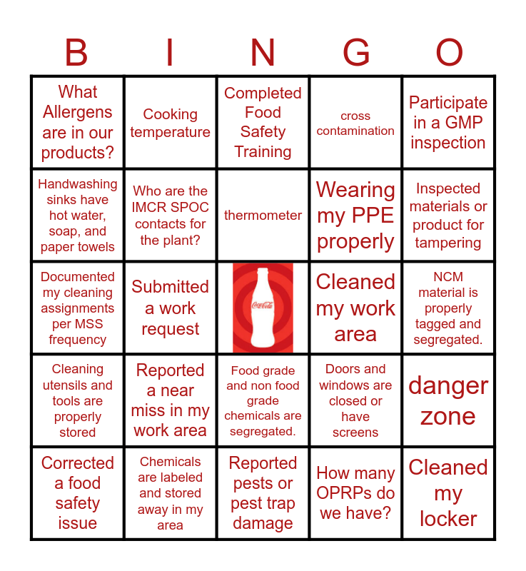 This bingo card has a free space and 29 words: Corrected a food safety issue, Washed Hands properly after break, Submitted a work request, Participate in a food safety meeting, What Allergens are in our products?, Completed Food Safety Training, Who are the IMCR SPOC contacts for the plant?, Reported a near miss in my work area, Cleaned my work area, Chemicals are labeled and stored away in my area, NCM material is properly tagged and segregated., Cleaned my locker, Reported pests or pest trap damage, How many OPRPs do we have?, Inspected materials or product for tampering, Report broken glass or brittle plastic in my area, Food grade and non food grade chemicals are segregated., Cleaning utensils and tools are properly stored, Participate in a GMP inspection, Documented my cleaning assignments per MSS frequency, Doors and windows are closed or have screens, How many Critical Control Points do we have?, Wearing my PPE properly, Handwashing sinks have hot water, soap, and paper towels, cross contamination, Cooking temperature, danger zone, thermometer and critical.
