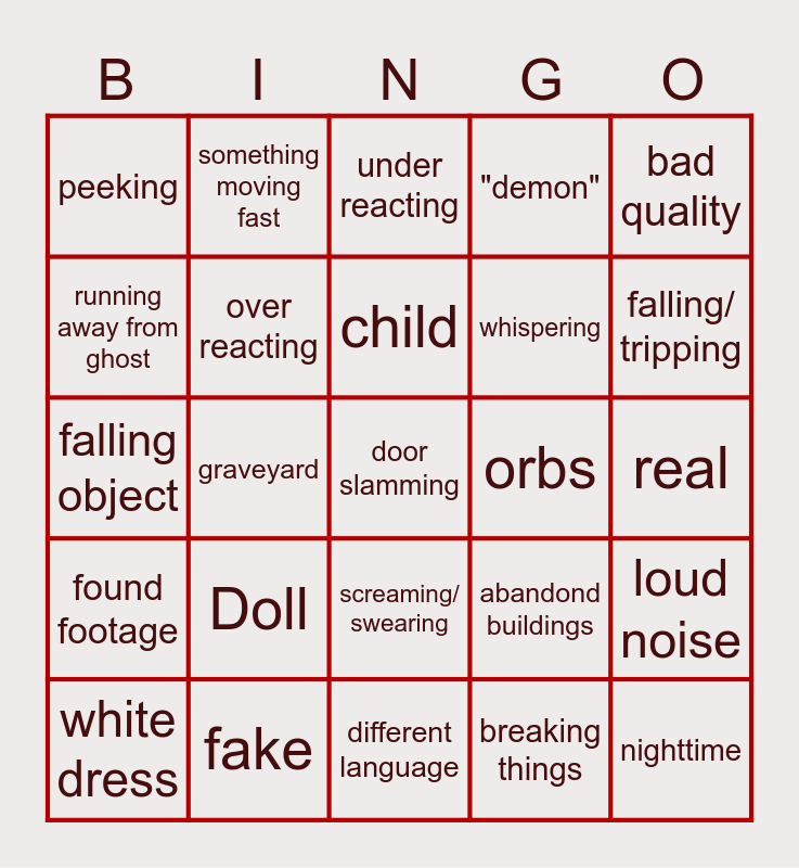This bingo card has a free space and 24 words: Doll, fake, child, white dress, bad quality, peeking, running away from ghost, something moving fast, orbs, screaming/ swearing, whispering, falling object, abandond buildings, loud noise, over reacting, breaking things, real, under reacting, falling/ tripping, graveyard, nighttime, found footage, "demon" and different language.