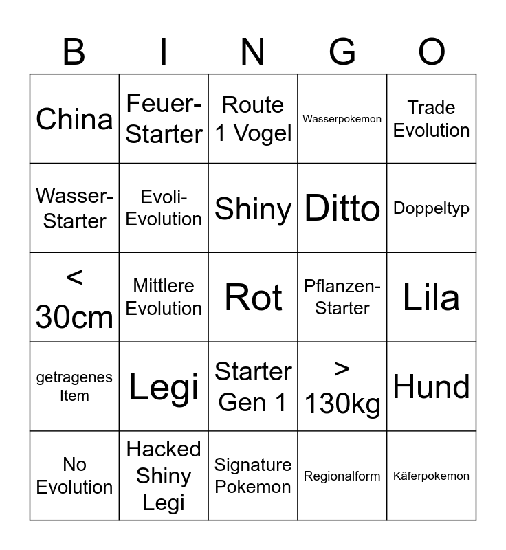 This bingo card has a free space and 24 words: Legi, Hacked Shiny Legi, Shiny, No Evolution, Trade Evolution, China, Wasser-Starter, Feuer-Starter, Pflanzen-Starter, Starter Gen 1, Ditto, < 30cm, > 130kg, Hund, Evoli-Evolution, Regionalform, Lila, Route 1 Vogel, Doppeltyp, Mittlere Evolution, Käferpokemon, getragenes Item, Wasserpokemon and Signature Pokemon.