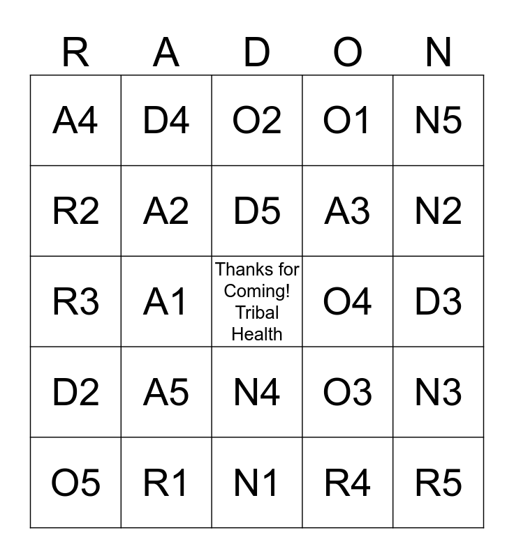This bingo card has a free space and 24 words: A5, R1, D5, O5, N5, A4, R2, D4, O4, N4, A3, R3, O3, N3, A2, R4, D3, O2, N2, A1, R5, D2, O1 and N1.