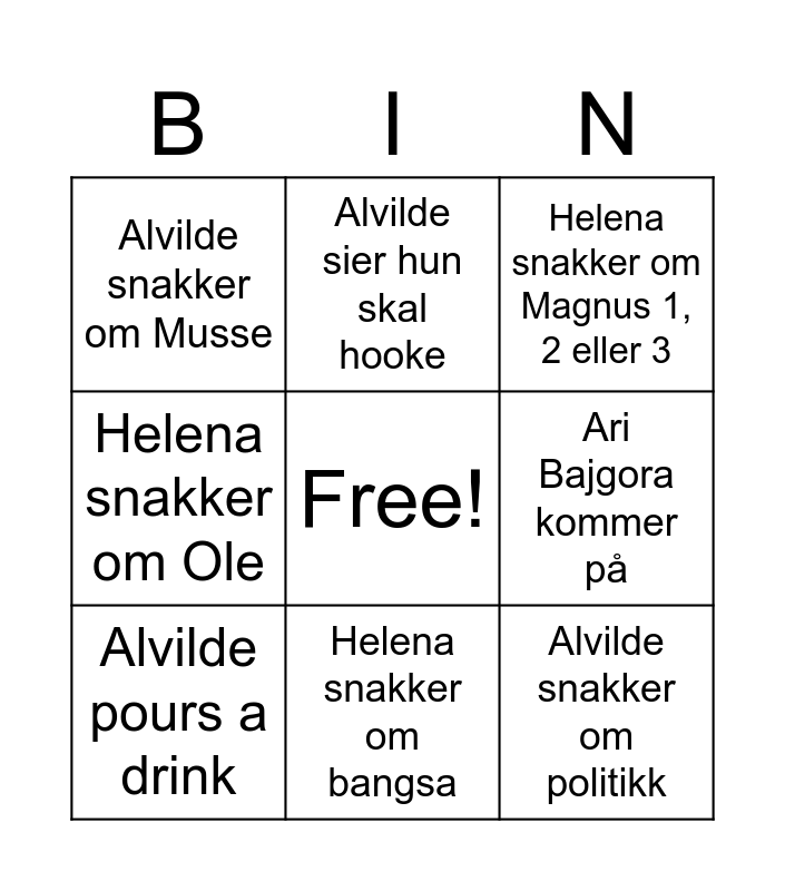 This bingo card has a free space and 11 words: Helena klager på bangsa, Helena snakker om bangsa, Alvilde snakker om politikk, Alvilde pours a drink, Alvilde sier hun skal hooke, Helena snakker om Magnus 1, 2 eller 3, Ari Bajgora kommer på, Alvilde snakker om Musse, Helena snakker om Ole, Alvilde snakker om Musse and Noen av de tar opp bas.