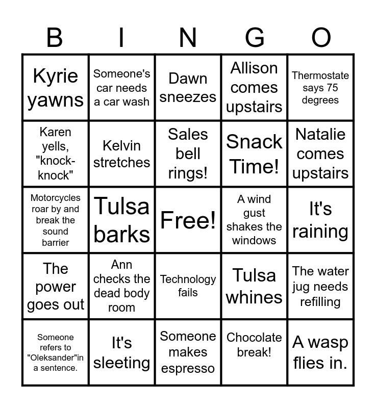 This bingo card has a free space and 29 words: Someone refers to "Oleksander"in a sentence., Call for Westward Tools, Tulsa barks, Car moving reminder, Kyrie yawns, Dawn sneezes, Kelvin stretches, Ann checks the dead body room, A wind gust shakes the windows, It's sleeting, It's raining, A wasp flies in., Someone makes espresso, Chocolate break!, Natalie comes upstairs, A guest visits the office, Technology fails, The power goes out, Thermostate says 75 degrees, Motorcycles roar by and break the sound barrier, Tulsa whines, A package is delivered, Snack Time!, Karen yells, "knock-knock", Allison comes upstairs, Someone's car needs a car wash, The water jug needs refilling, Sales bell rings! and I need a drink!.