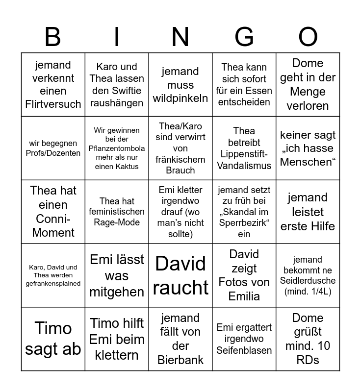 This bingo card has 25 words: Emi lässt was mitgehen, jemand fällt von der Bierbank, Thea/Karo sind verwirrt von fränkischem Brauch, Timo sagt ab, Dome geht in der Menge verloren, jemand verkennt einen Flirtversuch, wir begegnen Profs/Dozenten, Karo und Thea lassen den Swiftie raushängen, jemand setzt zu früh bei „Skandal im Sperrbezirk“ ein, David raucht, Thea betreibt Lippenstift-Vandalismus, Thea hat einen Conni-Moment, David zeigt Fotos von Emilia, jemand bekommt ne Seidlerdusche (mind. 1/4L), Wir gewinnen bei der Pflanzentombola mehr als nur einen Kaktus, Dome grüßt mind. 10 RDs, jemand leistet erste Hilfe, jemand muss wildpinkeln, keiner sagt „ich hasse Menschen“, Thea hat feministischen Rage-Mode, Emi kletter irgendwo drauf (wo man’s nicht sollte), Timo hilft Emi beim klettern, Karo, David und Thea werden gefrankensplained, Thea kann sich sofort für ein Essen entscheiden and Emi ergattert irgendwo Seifenblasen.