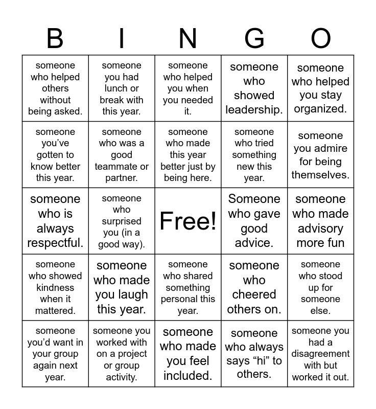 This bingo card has a free space and 24 words: someone who made you laugh this year., someone you worked with on a project or group activity., someone who made this year better just by being here., someone you’d want in your group again next year., someone who helped you stay organized., someone who helped others without being asked., someone you’ve gotten to know better this year., someone you had lunch or break with this year., Someone who gave good advice., someone who shared something personal this year., someone who tried something new this year., someone who is always respectful., someone who cheered others on., someone who stood up for someone else., someone who was a good teammate or partner., someone who always says “hi” to others., someone who made advisory more fun, someone who helped you when you needed it., someone you admire for being themselves., someone who surprised you (in a good way)., someone you had a disagreement with but worked it out., someone who showed kindness when it mattered., someone who showed leadership. and someone who made you feel included..