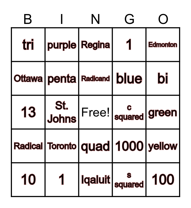 This bingo card has a free space and 24 words: Toronto, 1, Radicand, 10, Edmonton, tri, Ottawa, purple, c squared, quad, blue, 13, 1000, yellow, penta, s squared, green, Regina, bi, St. Johns, 100, Radical, 1 and Iqaluit.